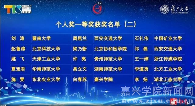 7月27至29日,由教育部高等教育司指导、中国高等教育学会主办的首届全国高校教师教学创新大赛全国赛在复旦大学举行。嘉兴学院文法学院白春苏团队(白春苏、张宇、李俐兴、向洁茹)代表浙江省中级及以下组参赛并喜获全国一等奖,这是嘉兴学院教师首次在国家级教学竞赛中获最高奖。