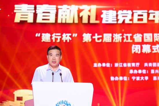 7月23日下午,“建行杯”第七届浙江省国际“互联网+”大学生创新创业大赛闭幕式暨颁奖典礼在嘉兴学院举行。浙江省教育厅二级巡视员王振斌,嘉兴学院党委书记卢新波,浙江省科协副主席陆锦,中国建设银行浙江省分行副行长郑浩,浙江师范大学党委副书记朱坚,嘉兴学院副院长张琦,宁波工程学院副院长徐可明,嘉兴职业技术学院副院长庄应强等领导出席。浙江省教育厅、中国建设银行浙江省分行、浙江省科协、共青团浙江省委等单位职能处室负责人,嘉兴市教育局、中国建设银行嘉兴分行负责人,全省高校创业学院负责人及师生代表参加线下活动。闭幕式进行了网络同步直播,300余万师生群众在线收看。
