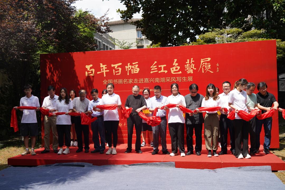 今天上午十点,“百年百幅·红色艺履——全国书画名家走进嘉兴南湖采风写生作品展”嘉兴巡展开幕式在嘉兴美术馆隆重举行。浙江省美协副主席、浙江画院院长孙永,中国美术学院博导张谷旻,嘉兴画院院长、嘉兴美术馆馆长凌加春,嘉兴市美协主席孙海峰,嘉兴学院党委书记卢新波,嘉兴南湖学院校长贾文胜等领导与嘉宾出席开幕式,仪式由《中国美术报》社社长、总编辑王平主持。