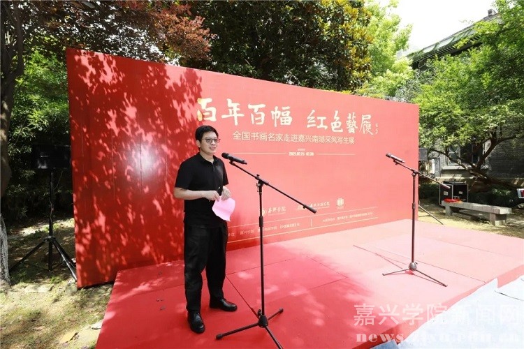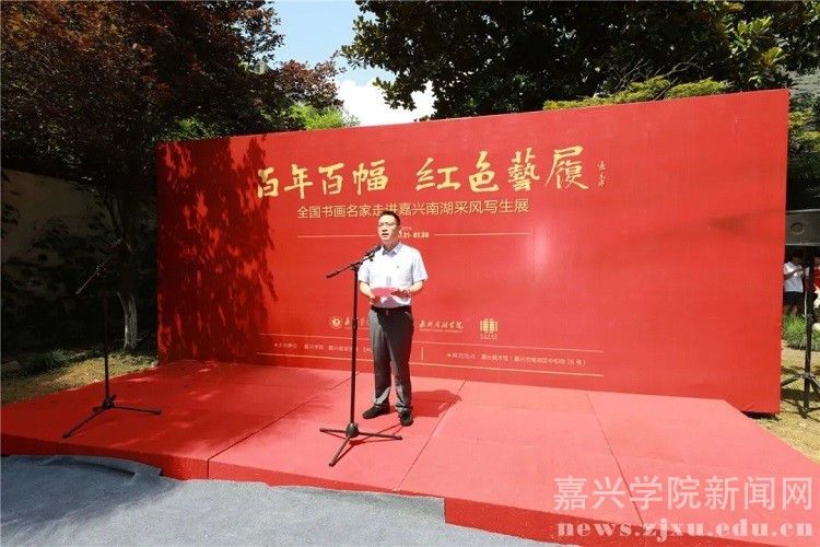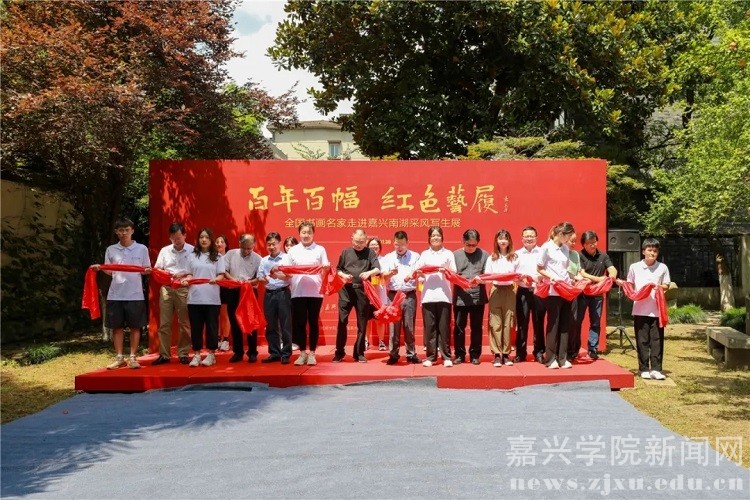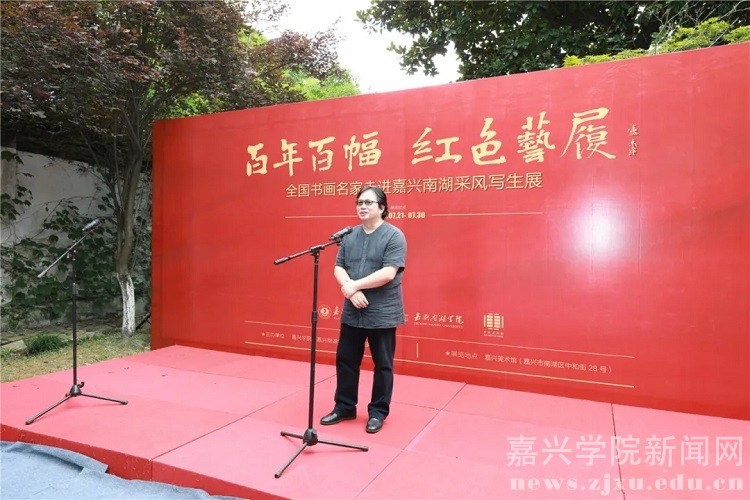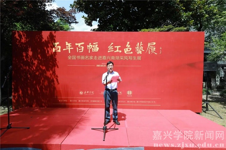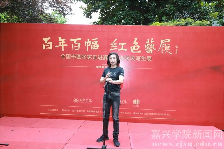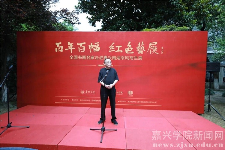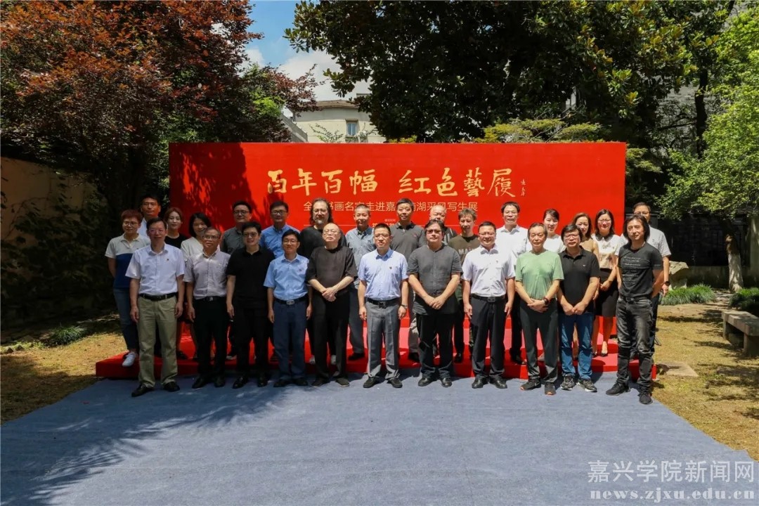 “百年百幅•红色艺履”是嘉兴学院、嘉兴南湖学院、《中国美术报》社联合主办,书画名家们倾情支持,高校师生热情参与的一场集革命洗礼、艺术交流、公益奉献相结合的红色之旅、艺术之旅、美育之旅。曾先后于5月24日至27日,7月11日至17日,分别在嘉兴举办了“百年百幅·红色艺履——全国书画名家走进嘉兴南湖采风写生暨进校园系列活动”的启动仪式,在北京《中国美术报》艺术中心举行了“百年百幅·红色艺履——全国书画名家走进嘉兴南湖采风写生作品展”首展,架起了首都北京与嘉兴南湖的艺术桥梁。7月21日至30日,作为此次系列活动的收官之站,该展览移师嘉兴美术馆,通过系列饱含特殊意义、展示根脉之美的作品,为嘉兴民众和学院师生提供一次感受文化魅力、培育文明风尚、增强文化自信、共享艺术之美的机会。