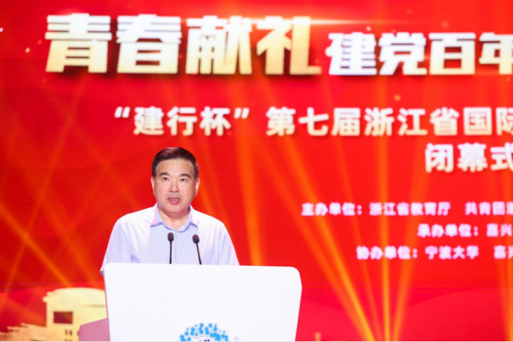 7月23日下午,“建行杯”第七届浙江省国际“互联网+”大学生创新创业大赛闭幕式暨颁奖典礼在嘉兴学院举行。浙江省教育厅二级巡视员王振斌,嘉兴学院党委书记卢新波,浙江省科协副主席陆锦,中国建设银行浙江省分行副行长郑浩,浙江师范大学党委副书记朱坚,嘉兴学院副院长张琦,宁波工程学院副院长徐可明,嘉兴职业技术学院副院长庄应强等领导出席。浙江省教育厅、中国建设银行浙江省分行、浙江省科协、共青团浙江省委等单位职能处室负责人,嘉兴市教育局、中国建设银行嘉兴分行负责人,全省高校创业学院负责人及师生代表参加线下活动;闭幕式进行了网络同步直播,300余万师生群众在线收看。