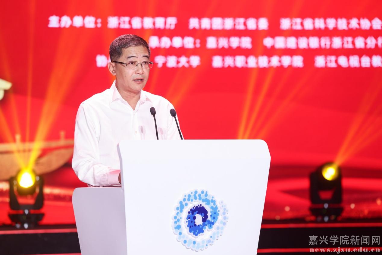 7月23日下午,“建行杯”第七届浙江省国际“互联网+”大学生创新创业大赛闭幕式暨颁奖典礼在嘉兴学院举行。浙江省教育厅二级巡视员王振斌,嘉兴学院党委书记卢新波,浙江省科协副主席陆锦,中国建设银行浙江省分行副行长郑浩,浙江师范大学党委副书记朱坚,嘉兴学院副院长张琦,宁波工程学院副院长徐可明,嘉兴职业技术学院副院长庄应强等领导出席。浙江省教育厅、中国建设银行浙江省分行、浙江省科协、共青团浙江省委等单位职能处室负责人,嘉兴市教育局、中国建设银行嘉兴分行负责人,全省高校创业学院负责人及师生代表参加线下活动;闭幕式进行了网络同步直播,300余万师生群众在线收看。