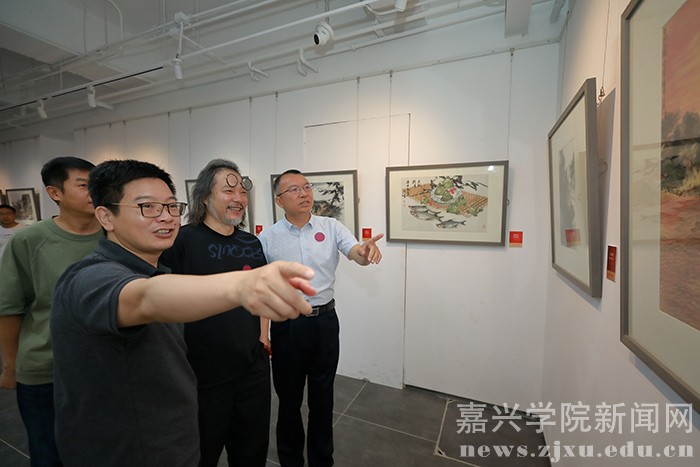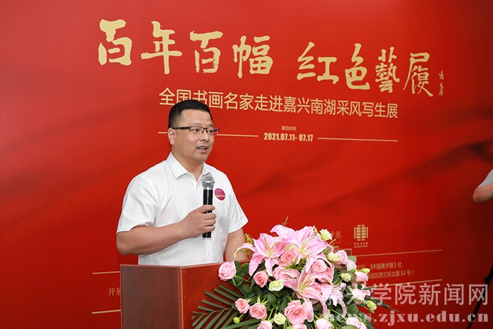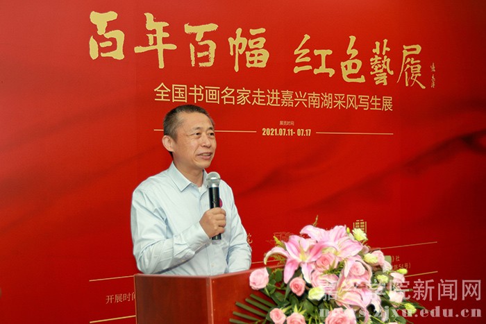 王平在致辞中介绍了此次活动的初衷与特色,他表示,此次展览虽然规模不大,作品尺幅不大,但却是一个小中见大的展览,从这些具有丰富内涵的作品中,我们可以感受到艺术家通过创作,将嘉兴红色文化和传统文化结合起来,通过写生切身感受国家站起来、富起来、强起来的伟大民族复兴历程。此外,这也是一个别有意味的展览,写生采风过程中,还组织举办了系列公益活动,如为高校开设专题讲座、捐赠作品等,这些活动对建设和丰富校园文化、促进高校美育事业发展具有深远意义。艺术家们走进嘉兴南湖写生学习也为年轻学子树立了一个标杆,对他们的创作精神高度具有重要的指引作用。