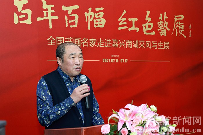 卢禹舜在致辞中表示,作为“百年百幅·红色艺履——全国书画名家走进嘉兴南湖采风写生暨进校园系列活动”重要内容的写生作品展,是艺术家把自己最鲜活、最富有情感、最打动人的写生之作集中呈现给观众的汇报展。在新时代党的事业发展的新阶段,美术家们需要深入到党史题材发生的“现场”去实地感受、搜集材料,并在艺术创作中,作全新的表达。在构思立意上赋予新的角度,在构图造型上追求新的形态。希望展览能让观众通过这些作品重温中国革命的伟大历程,感受先烈们火热的革命情怀,了解山河巨变的时代新貌。