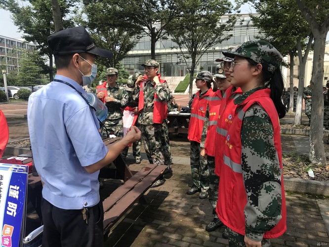 随着暑假的到来,嘉兴经开警管家志愿服务队又活跃起来,结合嘉兴经开区特点,积极参与到社会治理工作中去,形成“平安经开”最大合力。今天(7月5日)上午,嘉兴市公安局经开分局城南派出所民警张秋江和经开警管家志愿服务队成员,趁着嘉兴学院大学生军训间隙,对他们进行反诈精准宣传。