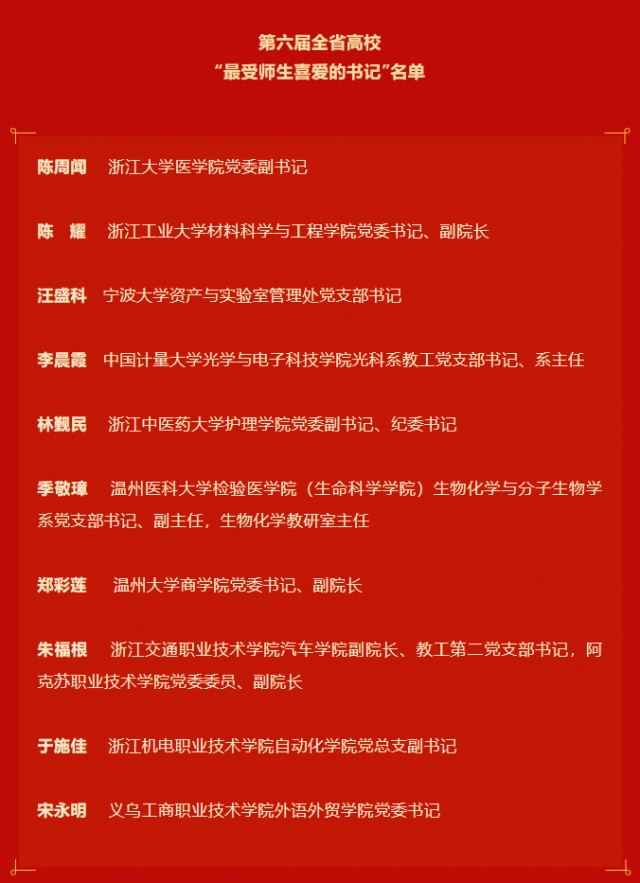 根据全省教育系统庆祝中国共产党成立100周年系列活动和党史学习教育安排,为充分发挥先进典型的示范引领作用,选树一批模范传承红色基因、践行初心使命的高校基层党组织书记,经省教育厅同意,省普通高校党建研究专业委员会、浙江教育报刊总社组织开展了第六届全省高校“最受师生喜爱的书记”选树宣传活动。