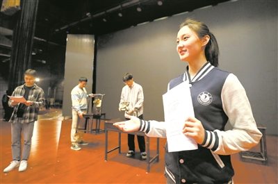 | 演出前的候场时间,指导教师王金超(左一)争分夺秒地给参演学生“补课”。每次演出结束后,她也会和参演学生一起分享经验、总结不足。 |