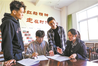 | “我从学姐手中接过来的接力棒要更好地传到学妹手里,让她们带着‘初心’继续前进。”剧中王会悟的扮演者大四学生高徐阳(左)给下一届扮演者讲解红船精神、分享表演心得。 |