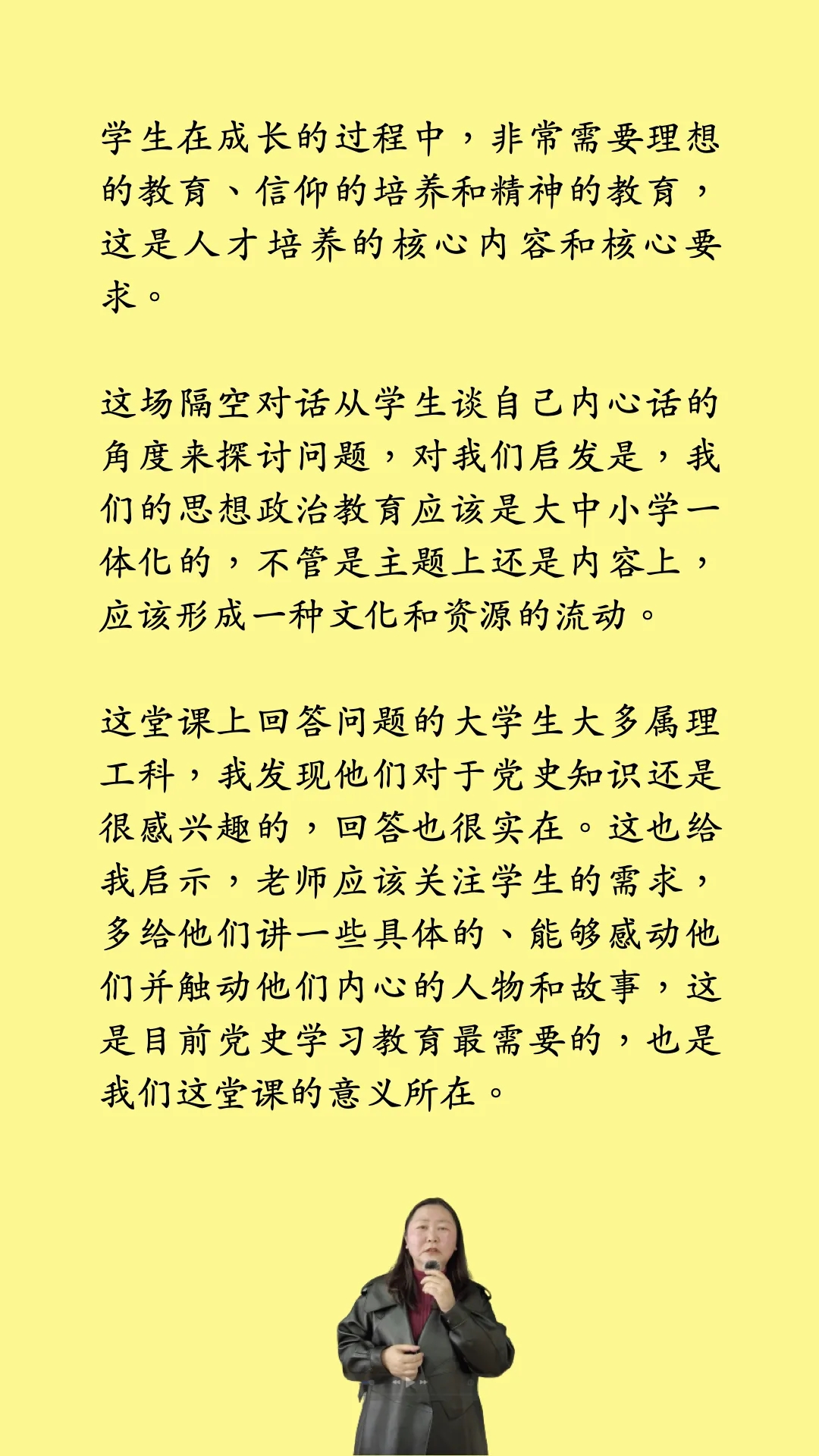 我们应该多关注党史里的一些关键人物、历史人物,这对于小学生的教育是非常形象、感人的。小学生所处的年龄阶段,非常需要理想式人物的感化作用。同学们当中,以后应该会有一部分人选择当一名教师,那么请你们记住,历史教育不应仅仅停留在书本上、停留在背答案上,而是要尽可能地增加理想教育的内容,让优秀榜样成为小学生的偶像,进而培养积极向上的心态。