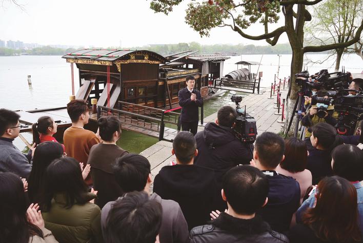 秀水泱泱,红船依旧;时代变迁,精神永恒。来自全国各地的游客们深情瞻仰红船,纷纷与红船合影,很多游客也被姜辉的宣讲所吸引,在一旁静静倾听。