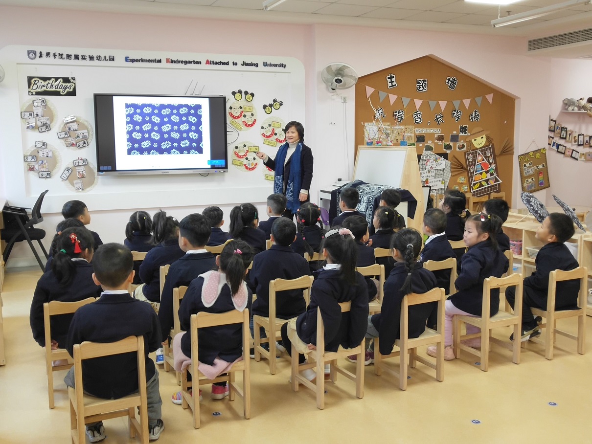 基于此,嘉兴学院设计学院副院长徐利平为附属实验幼儿园的小朋友们带来了一节关于蓝印花布的非遗小课堂。蓝印花布多少岁了?是怎么做成的?可以用来做什么?这些奇妙的知识都是小朋友们在徐利平的课堂中学到的。图文并茂的课件、形象生动的讲解,孩子们在徐利平的带领下走进了蓝印花布的世界,了解了这个嘉兴的传统非遗文化。