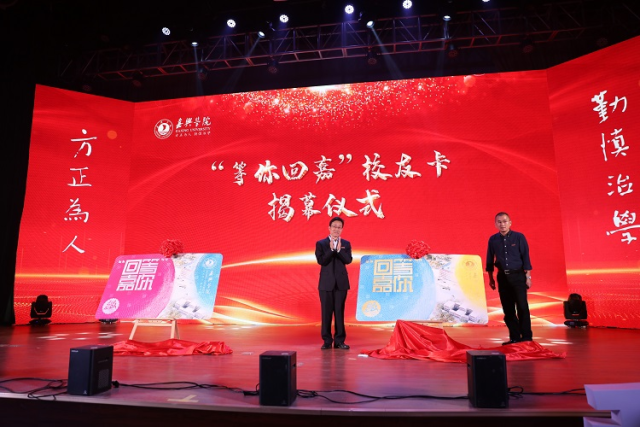 随后,举行了“等你回嘉”校友卡发行仪式。卢新波和校友卡设计者、设计学院教师许晓伟共同为校友卡揭幕。胡俊云为首批申领校友授卡。申领校友卡后,校友将可在学校图书馆阅览、食堂就餐、周边商业网点及酒店消费、校园进出、期刊获取、体育设施使用、文化产品购买等方面享受服务。
