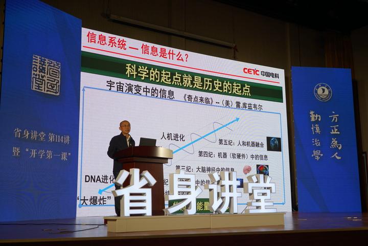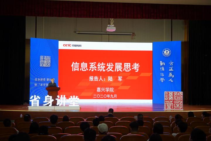 在习习秋风中,嘉兴学院迎来了新学期,也迎来了一批“新成员”。9月18日晚,嘉兴学院“省身讲堂”第114讲暨2020~2021学年第一学期“开学第一课”课堂正式开讲,而此次的嘉宾就是嘉兴学院院长、中国工程院院士、中国电子科技集团首席科学家——陆军。他为师生作了题为“信息系统发展思考”的讲座。300余名师生到场聆听,同时,这堂课也通过微博、抖音、微信等五大网络直播渠道现场直播。