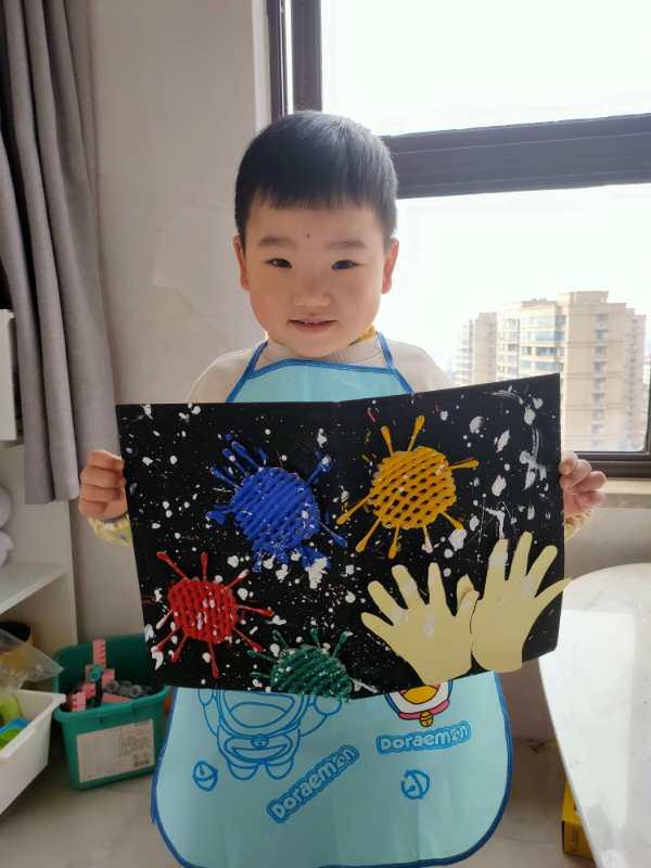 非常时期,家校间的暖心视频连线,有趣的“云端”微课,架起了师生间温暖的桥梁,将爱的种子播撒在了孩子的心坎里,这些种子在孩子们的心中生根发芽,小小的他们纷纷借“艺”抒情,将心中的爱,通过音频、绘画、手工作品、舞蹈视频等多种形式进行传递。小三班的詹明麒,爸爸是一名特警,妈妈在武警医院从事后勤工作,寒假里少了父母在身边,但在教师的“云端”陪伴下,她将对爸爸妈妈的思念和抗“疫”必胜的信心画进了《请不要食用蝙蝠》的儿童画中。小一班的罗雪儿穿着红色的裙子,手持国旗,让爸爸妈妈为自己精心录制了一段手语舞蹈视频,在视频中她边跳边呼喊“中国加油、武汉加油、嘉兴加油!”