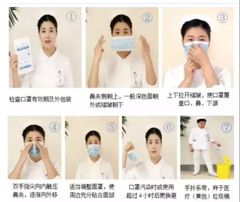 1、 正确佩戴口罩,做好防护工作。在佩戴口罩时尽量压紧鼻两侧的铝片,以便减少四周的泄漏,且佩戴后不要用手挤压口罩。