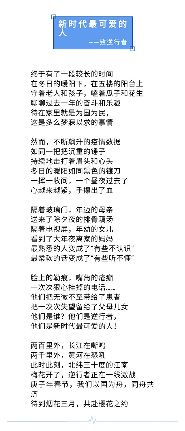 以诗言志,彰显浓浓的同胞情。“文章合为时而著,诗歌合为事而作。”疫情当前,嘉兴学院诗歌爱好者创作了《初心同在——献给红船旁最美逆行者》《火车驶向武汉》《新时代最可爱的人——致逆行者》《致敬武汉》《二月,风雪覆盖了大半个中国》《天就要亮了》《晚上九点的南溪西路》等10余篇诗歌,以诗言志,礼赞党中央的坚强领导,礼赞全国人民的众志成城,礼赞白衣天使的无私无畏,其中有多篇被“浙江诗人”《嘉兴日报》“读嘉”“东湖文艺”等媒体平台报道。还有老师以声传情,用《生死不离》等歌曲表达对生命的敬畏,以深深的同理心传递浓浓的同胞情。