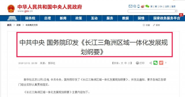 12月1日,中共中央、国务院印发《长江三角洲区域一体化发展规划纲要》,《纲要》是指导长三角地区当前和今后一个时期一体化发展的纲领性文件,是制定相关规划和政策的依据,规划期至2025年,展望到2035年。
