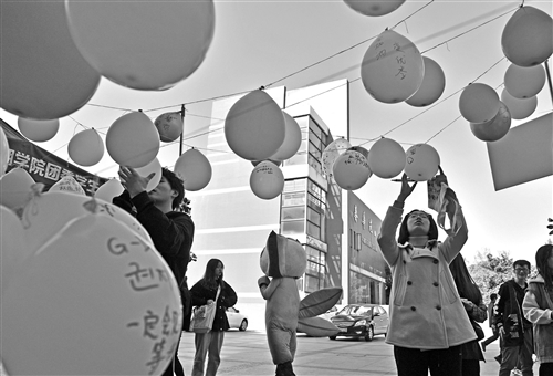 昨天中午,一次别开生面的“告白”气球活动在嘉兴学院越秀校区开展,南湖学院学生会权益部挂起了上百只彩色气球,由大学生们现场书写各种对学院的建议和告白。