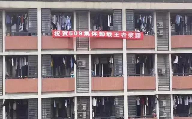 要卸载?共进退!509的四个大男孩便在宿舍阳台上挂出了一条横幅:“祝贺509集体卸载王者荣耀”。