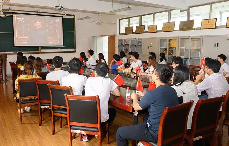 升旗仪式结束后,全体校领导、中层干部、离退休教师代表、师生代表在越秀校区第一报告厅、智慧教室、创业蜂巢等20多个收看点集中收看了庆祝中华人民共和国成立70周年大会、阅兵式和群众游行。