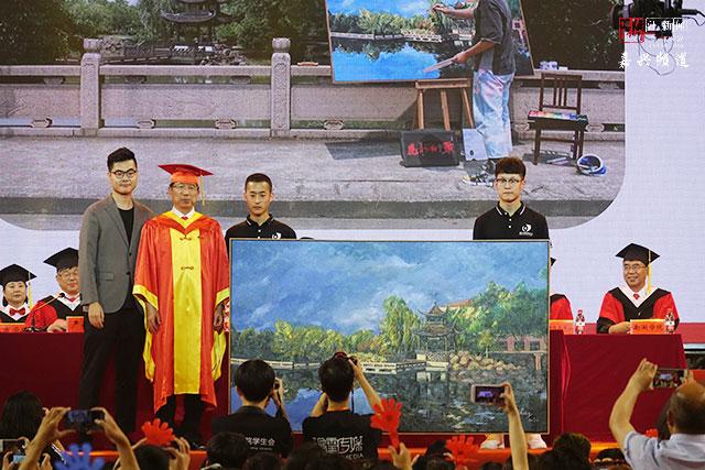 在这场典礼上,毕业生们收获了荣誉证书、毕业证书和学位证书,学校也获得了一份特别的礼物。学校首位考上中国美术学院的毕业生祁泽宇为母校赠送了纪念作品《初心》。同时,校友代表、浙江港流高分子科技股份有限公司董事长张朝设也向毕业生们分享了自己毕业后的人生经历和感悟。