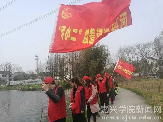 嘉兴学院学生志愿者跟着河长去巡河。