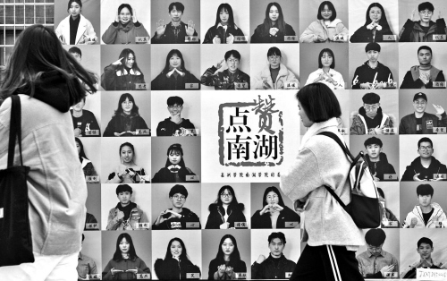 昨天上午,嘉兴学院越秀校区广场上,由大学生志愿者头像组成的巨幅海报成校园一景。据了解,在3月这个志愿服务宣传实践月,该校学子将开展一系列公益志愿服务。 ■摄影 记者 李剑铭