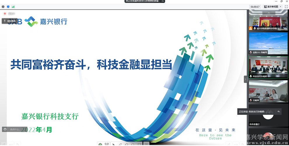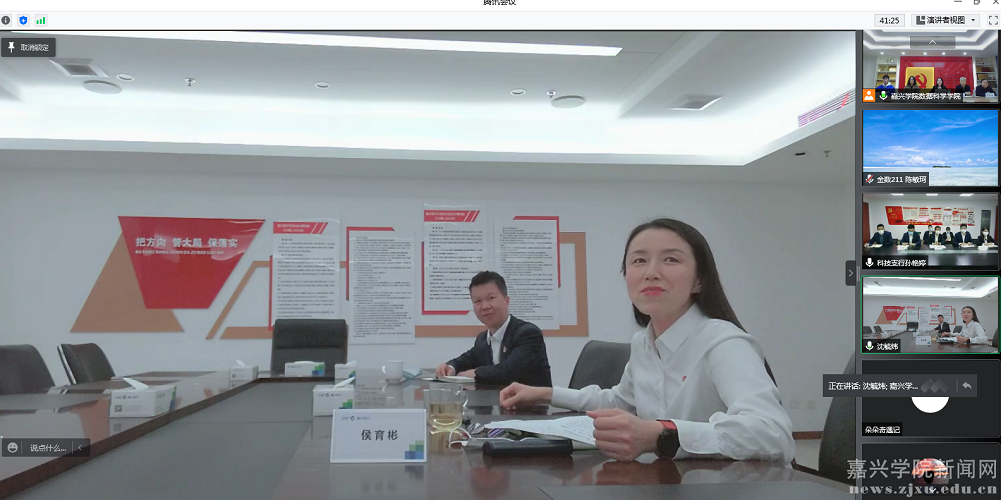 4月14日下午,数据科学学院与嘉兴银行开展了以“科技金融助力共同富裕”为主题的线上党建共建专题交流活动。嘉兴银行监事长侯育彬、嘉兴银行科技支行行长姚晓斌出席,嘉兴银行党群部及嘉银学院成员,科技支行党支部党员,数据科学学院数学与应用数学系党支部、统计系党支部、大数据工程系党支部党员及师生代表共90余人参加线上活动。