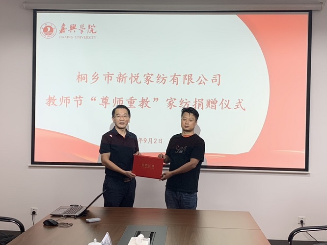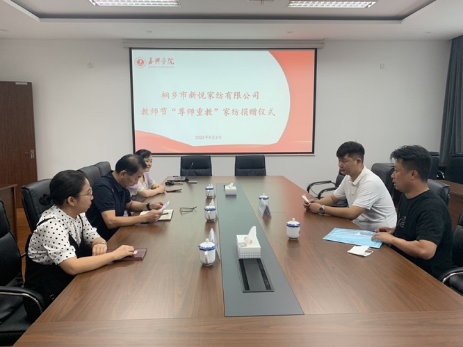 9月2日上午,在第三十八个教师节来临之际,桐乡市新悦家纺有限公司捐赠仪式在学校举行。校社会合作处、人事处、工会、教育发展基金会等部门相关负责人参加捐赠仪式。