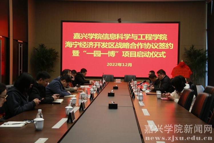 12月2日,信息科学与工程学院“一园一博”服务工作站启动及战略合作签约仪式在海宁经济开发区管委会举行。海宁经济开发区党工委副书记、管理委员会主任李振,海昌街道党委委员顾煜峰,信息科学与工程学院院长朱耀东、党委书记谢宏、博士教师代表及企业、平台代表出席活动。
