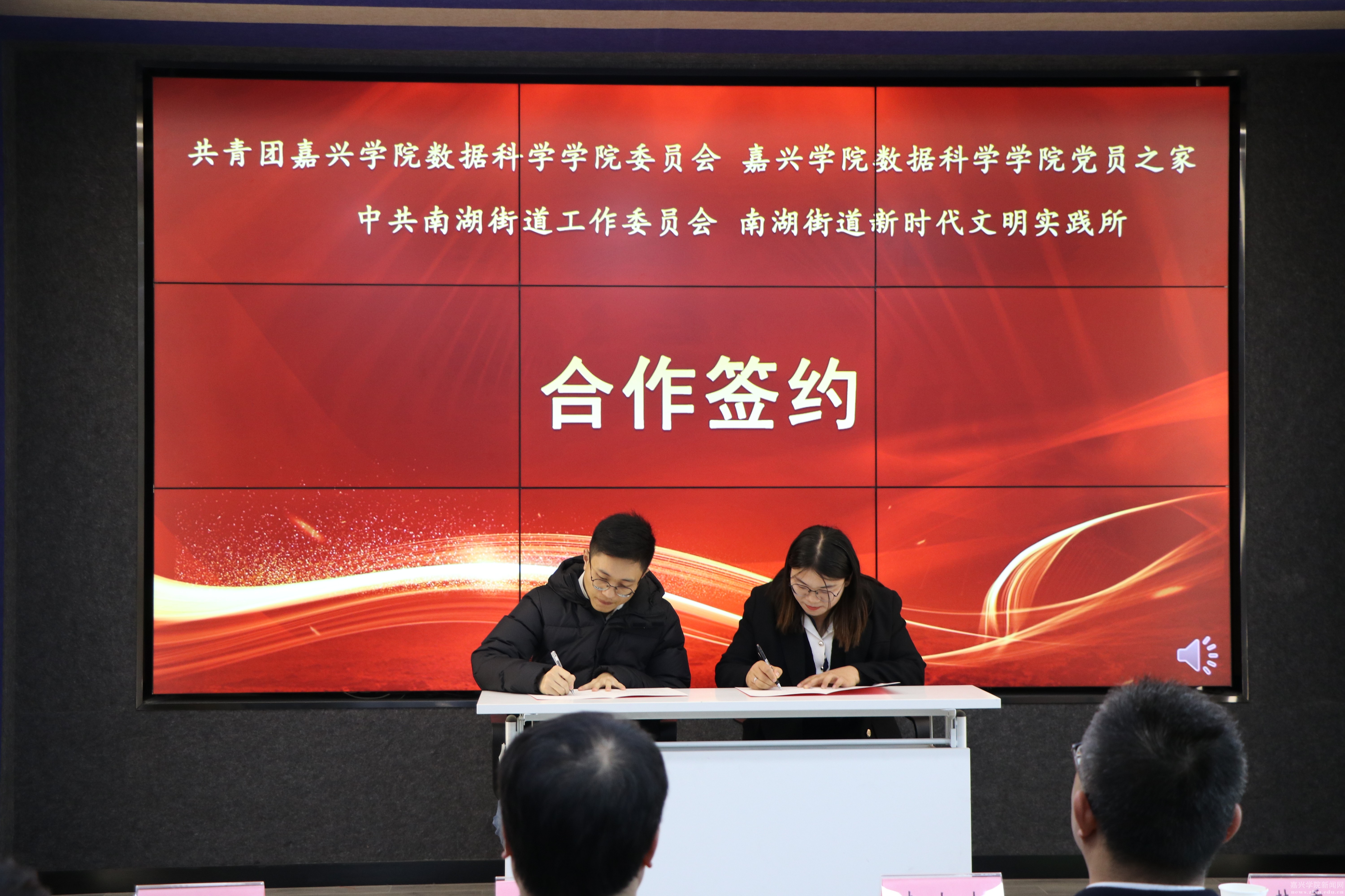仪式上,数据科学学院团委副书记、学生党支部书记王佳伟与南湖街道宣传委员韩秀风分别代表双方签订“数科智联”志愿服务项目协议,根据协议内容,接下来双方将在数科智联、文化传承、文明传播、经济发展、扶老助幼等方面开展“校地联合”志愿服务。