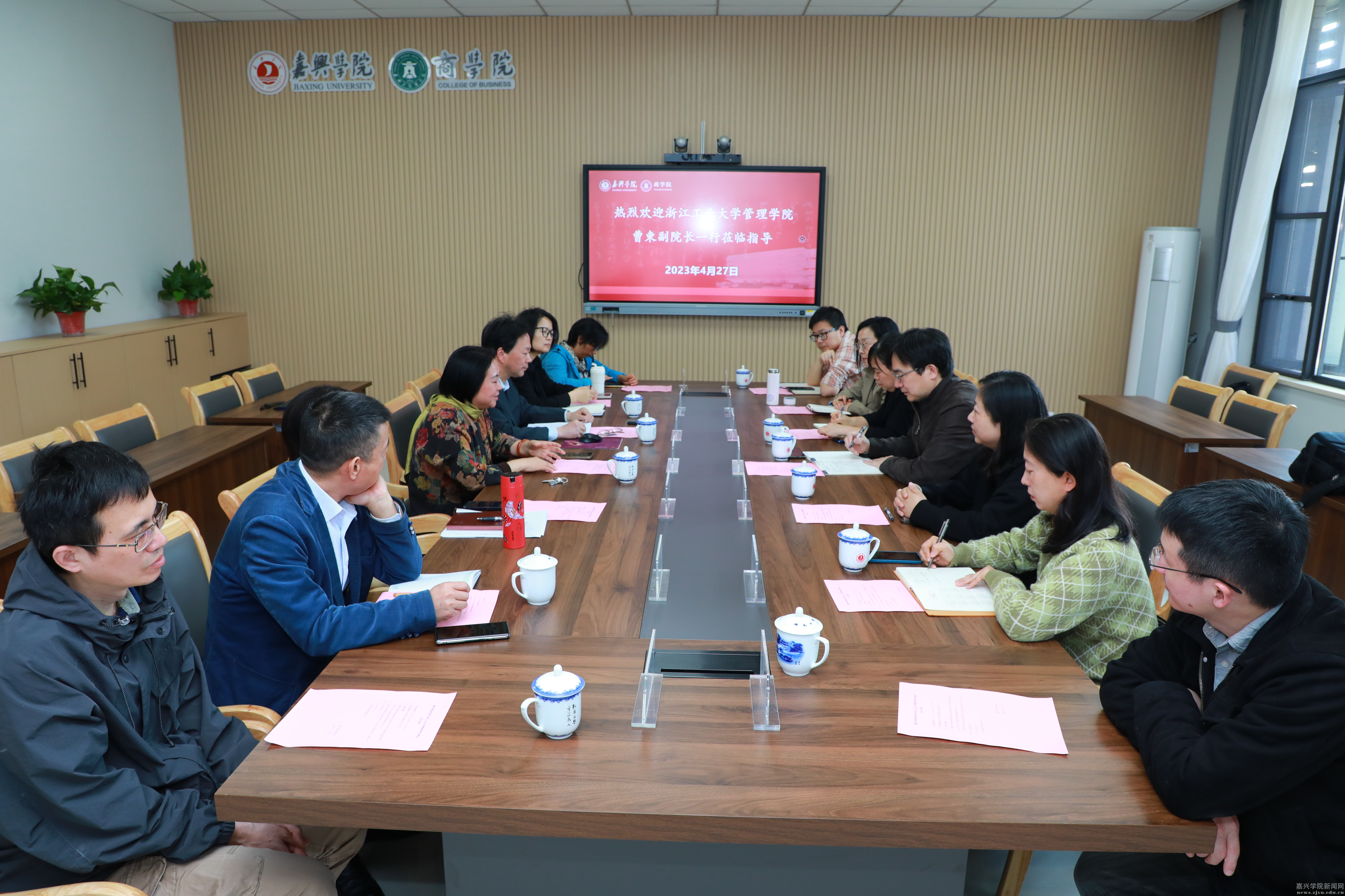 4月27日,浙江工业大学管理学院副院长曹柬一行到商学院调研交流。商学院院长、经管中心主任潘煜双,副院长李郁明,工商管理系、会计学系、信息管理与信息系统系、经济管理实验中心负责人及技术主管参加了交流会谈。