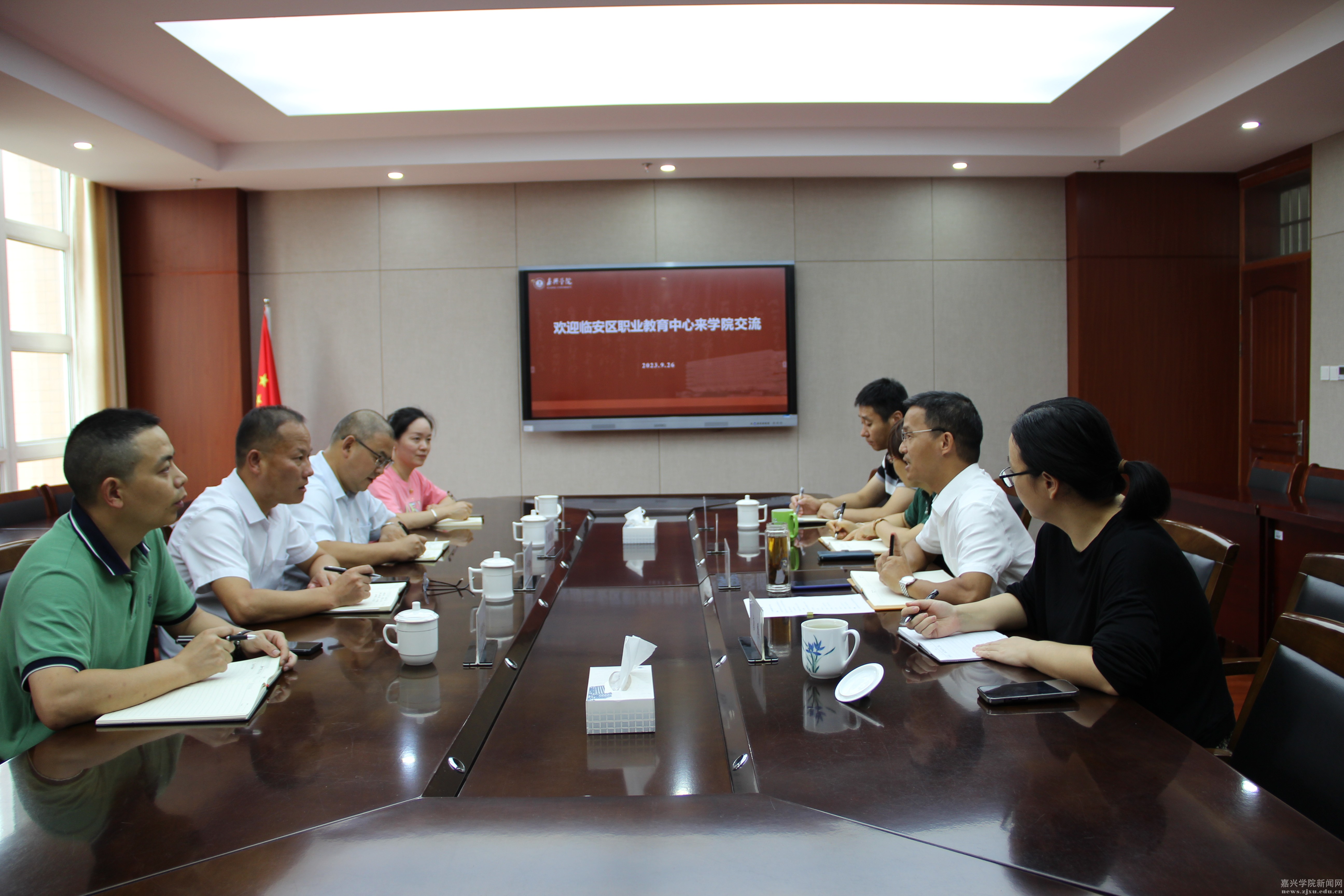 9月26日上午,临安区职业教育中心书记、校长方向如、副校长彭东明等一行5人来平湖师范学院(应用技术学院)交流。平湖师范学院(应用技术学院)党委副书记冯伟芳,学工办、教务办、学前教育系等相关负责人参加交流会。