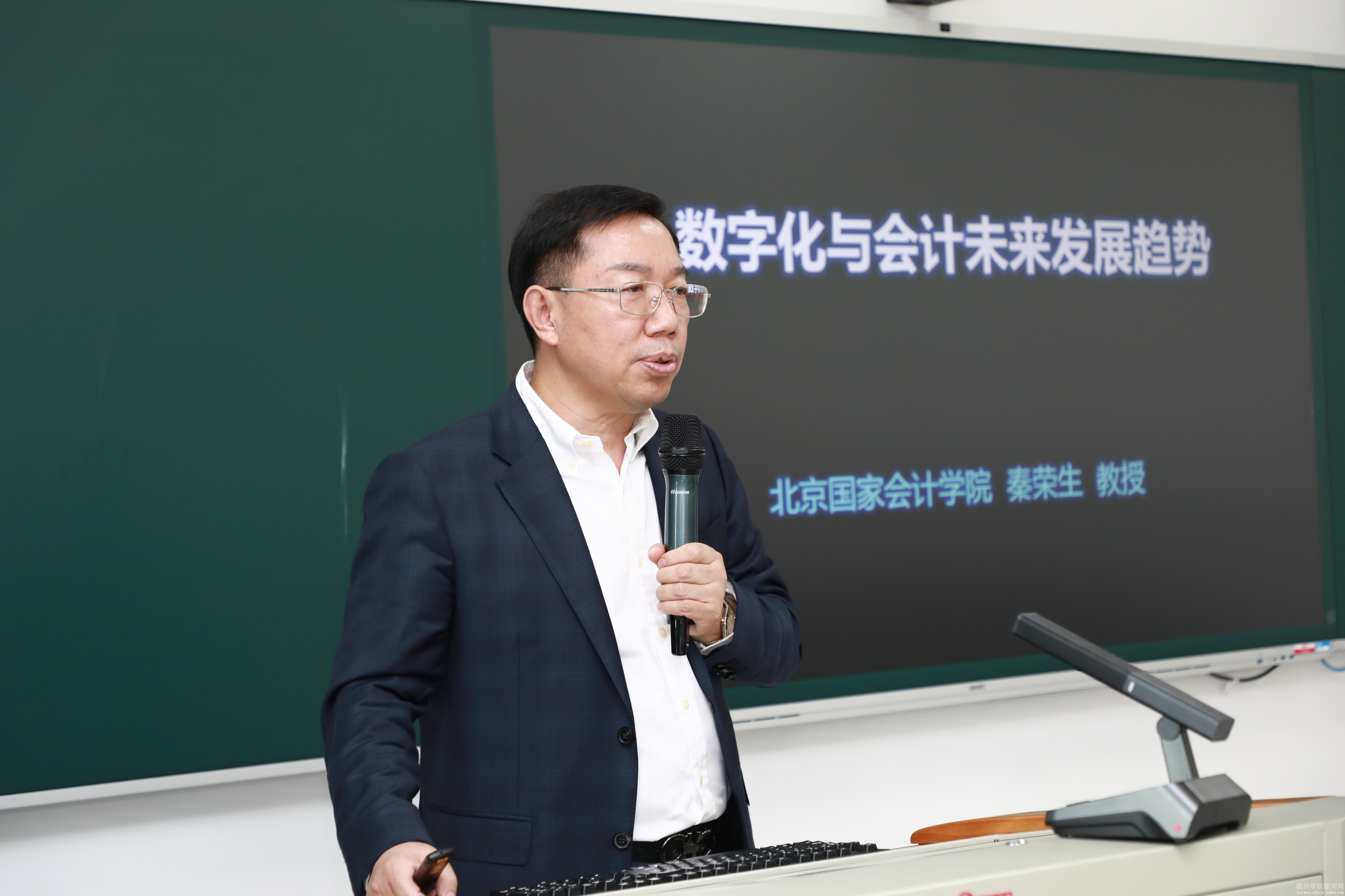 秦荣生以“数字化与会计未来发展趋势”为主题,从当前数字化技术给各行各业带来的冲击引入数字化的概念和特征,提出万物皆数据,一切都可以数字化,强调面对企业业务和管理活动的数字化,会计行业和会计人员应审时度势,更新会计的观念、技术和方法,加速实施会计数字化转型,构建一种新的与时代相适应的会计体系与模式,探索会计行业未来的发展道路。秦教授还指出数字化时代会计未来的发展方向:一是满足个性化会计服务需求;二是提供实时的财务会计数据;三是实施全员全面的管理会计;四是加强对数据的核算和管理;五是建设数智化的会计体系;六是培养高素质的会计人才,并鼓励同学们要紧跟时代的发展,不断学习新知识和新技术,培养自身的数字化导向思维,努力成为政治过硬、作风优良、履职尽责、专业高效的高端会计人才。