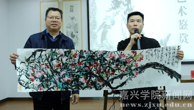 本次交流活动以《中国画艺术鉴赏》为主题,陈治良从岩画为始,选取中国历代经典水墨作品溯源中国画的发展和演变,用山水花鸟意象的细节深挖工笔与写意的区别与内涵。此外,陈治良还以“兰草”和“墨梅”为主题,通过现场实践教学的直观方式,为同学们演示笔墨技法的应用,在场的同学被深深吸引,皆目不转睛的围绕一旁。