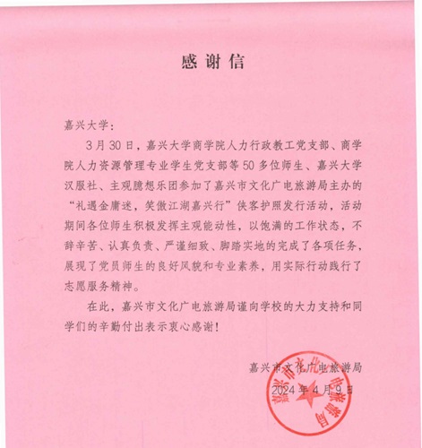 近日,嘉兴市文化广电旅游局向我校发来感谢信,对商学院人力行政教工党支部、商学院人力资源管理专业学生党支部、嘉兴大学汉服社、主观臆想乐团等50多位师生在金庸先生诞辰100周年文化交流活动之 “礼遇金庸迷,笑傲江湖嘉兴行”侠客护照发行活动中的辛勤付出表示感谢。