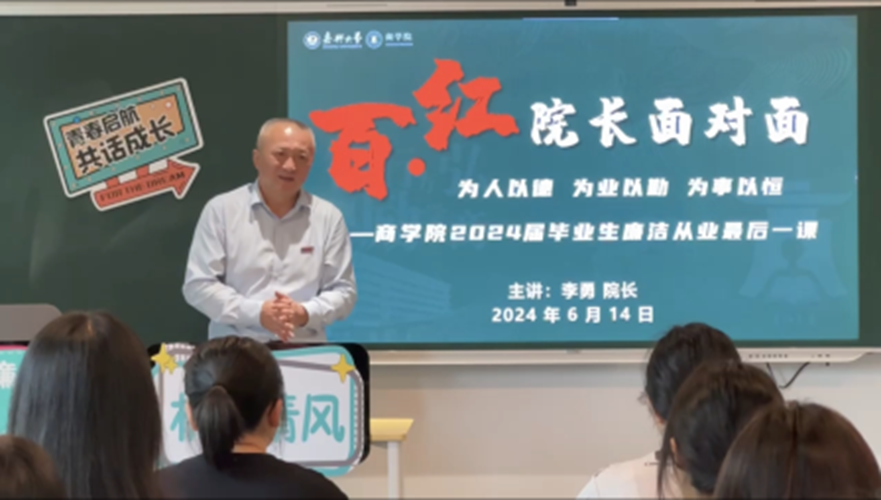 6月14日下午,商学院院长李勇教授应邀为学院2024届毕业生代表讲授主题为“为人以德 为业以勤 为事以恒”的大学“最后一课”。学院党委副书记、纪委书记潘欣主持。