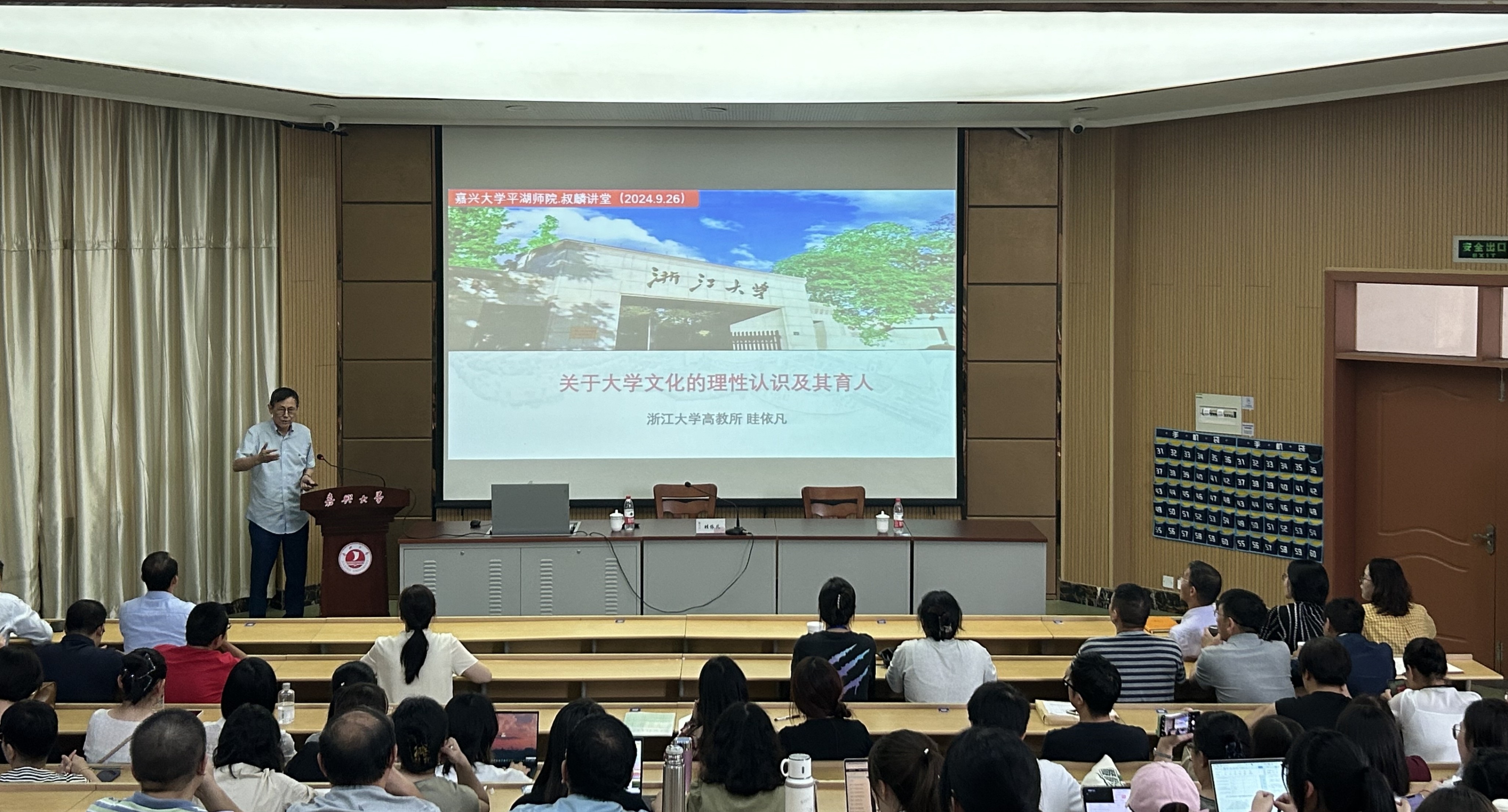 9月26日,浙江大学求是特聘教授、高教研究所所长、教育学院博士生导师眭依凡教授应邀作客平湖师范学院“叔麟讲堂”首讲。学院副院长(主持工作)朱小烽主持讲座,学院全体教职工及学生代表到场聆听。