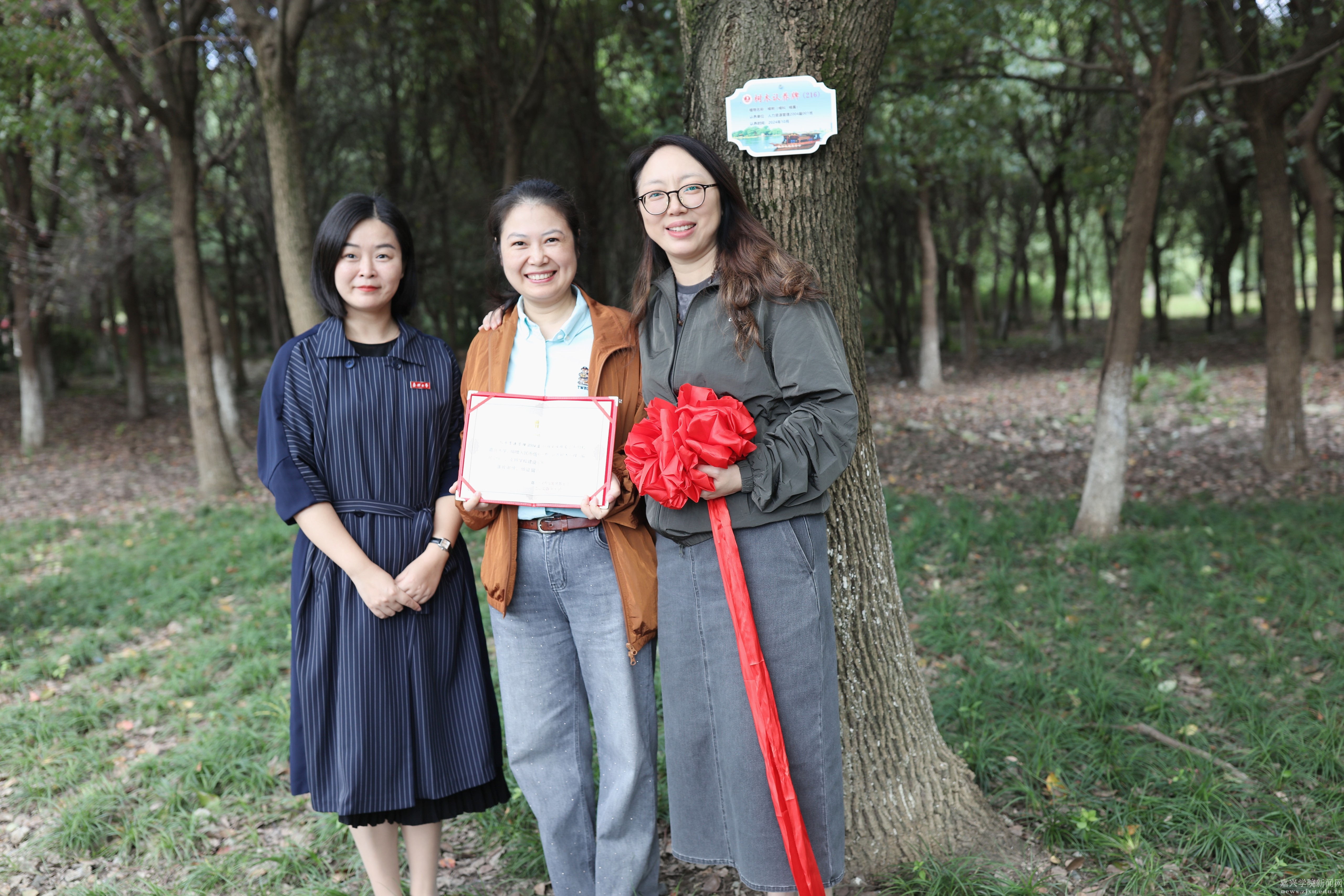 仪式上,潘欣代表学院与校友代表们一起为校友树揭牌并分别为校友代表颁发捐赠证书。