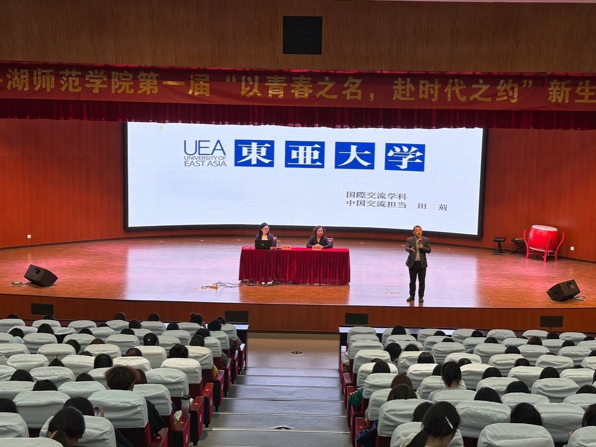 田荊详细介绍了学校与东亚大学的合作交流项目,针对学生交换学习项目及毕业后留学深造规划等问题展开现场交流。她鼓励在场学生积极申报各类国际交流项目,拓展国际视野。
