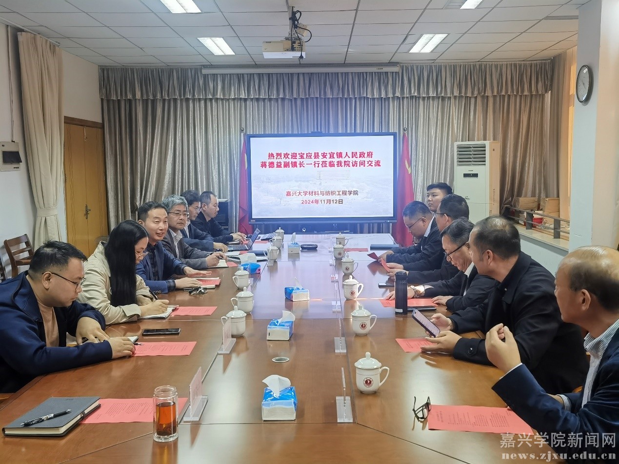 11月12日上午,江苏省宝应县安宜镇副镇长蒋德益、安宜镇社会治理办公室主任陶连国、安宜镇经济发展办公室主任陈军、海晟科技(浙江)有限公司总经理朱晓伟、浙江雅娜纺织有限公司办公室主任冯一波等一行到材纺学院访问交流。学院举行了交流座谈会,会议由学院副院长(主持工作)沈加加主持,原院长易洪雷、优秀教师代表参加。