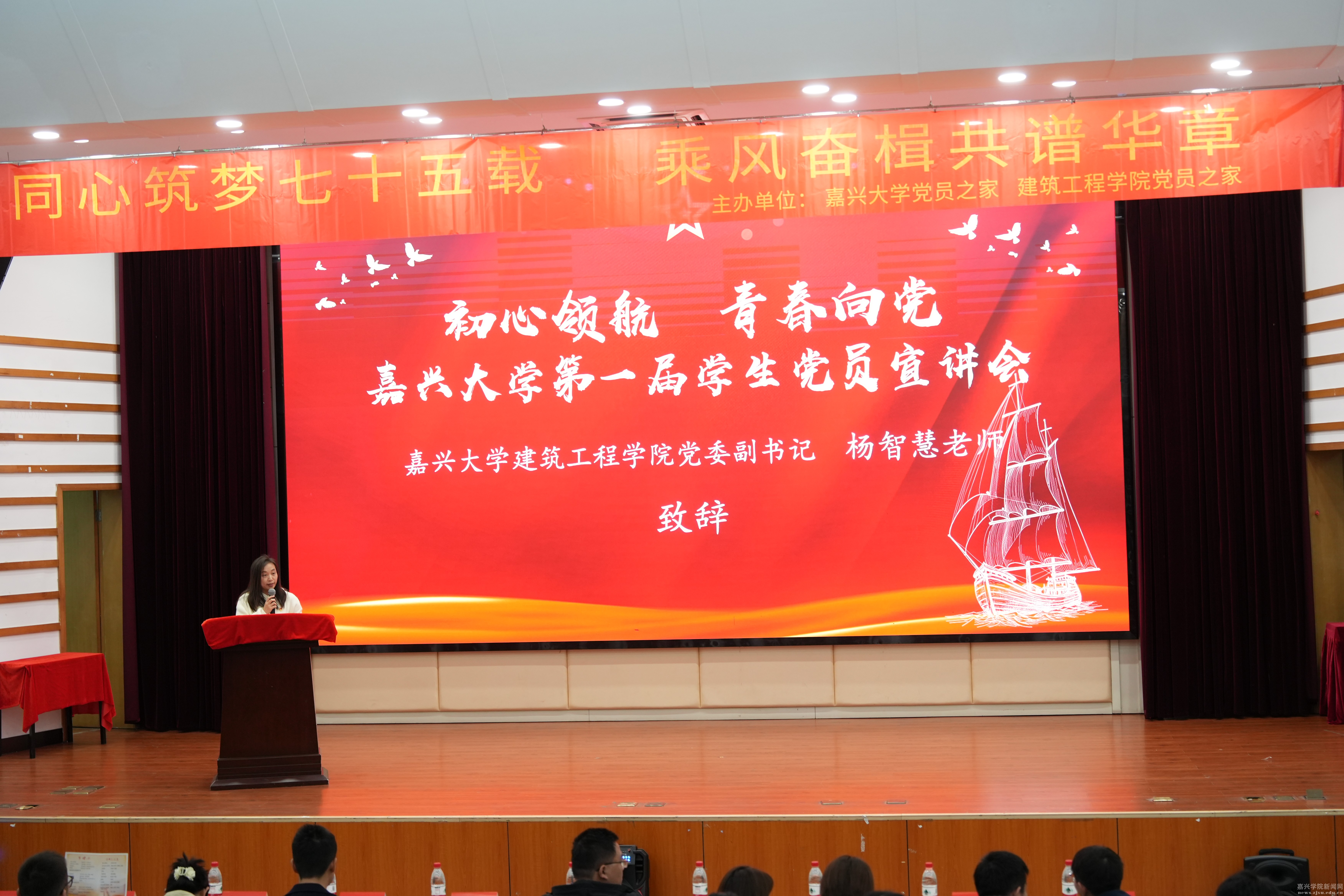 2024年11月24日下午,由建筑工程学院党员之家承办的“初心领航 青春向党——嘉兴大学第一届学生党员宣讲会”在梁林校区TCL报告厅圆满开展。建筑工程学院党委副书记杨智慧,嘉兴南湖革命纪念馆宣教处郑皓,嘉兴大学党委组织部袁泽浩,各学院学生党员之家指导老师、党员之家主任、学生党员代表参加宣讲会。