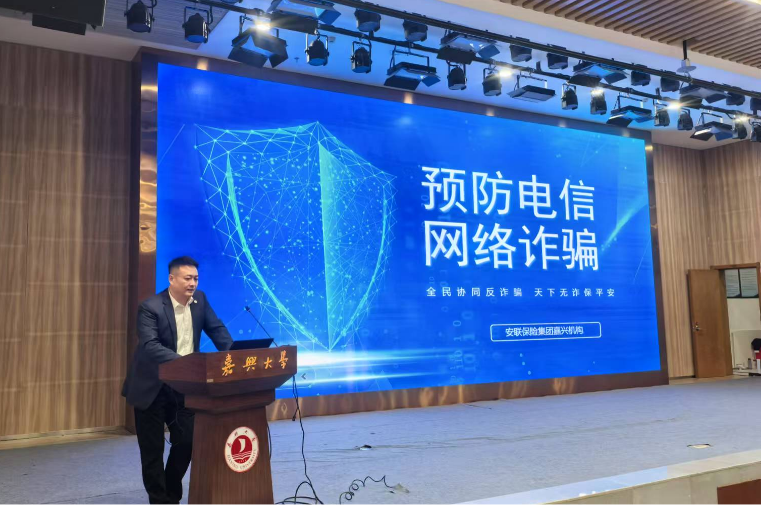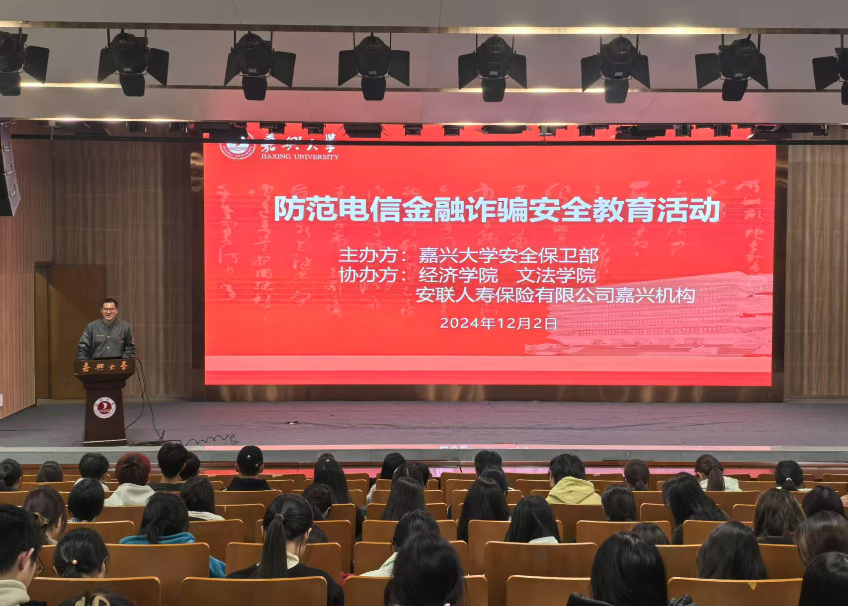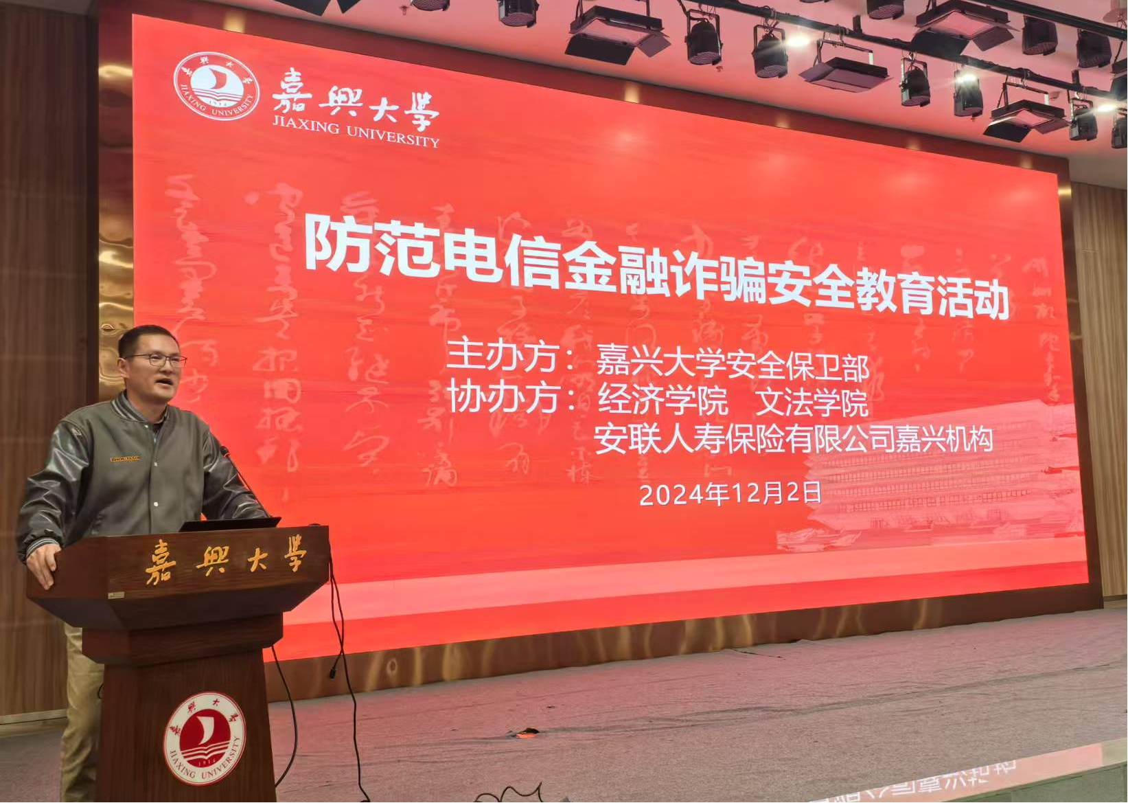 2024年12月2日晚,由嘉兴大学安全保卫部主办,经济学院、文法学院、安联人寿保险有限公司嘉兴机构协办的“防范电信金融诈骗安全教育活动”,在我校图书馆学术报告厅顺利举行。活动由安全保卫部副部长李联钊主持。