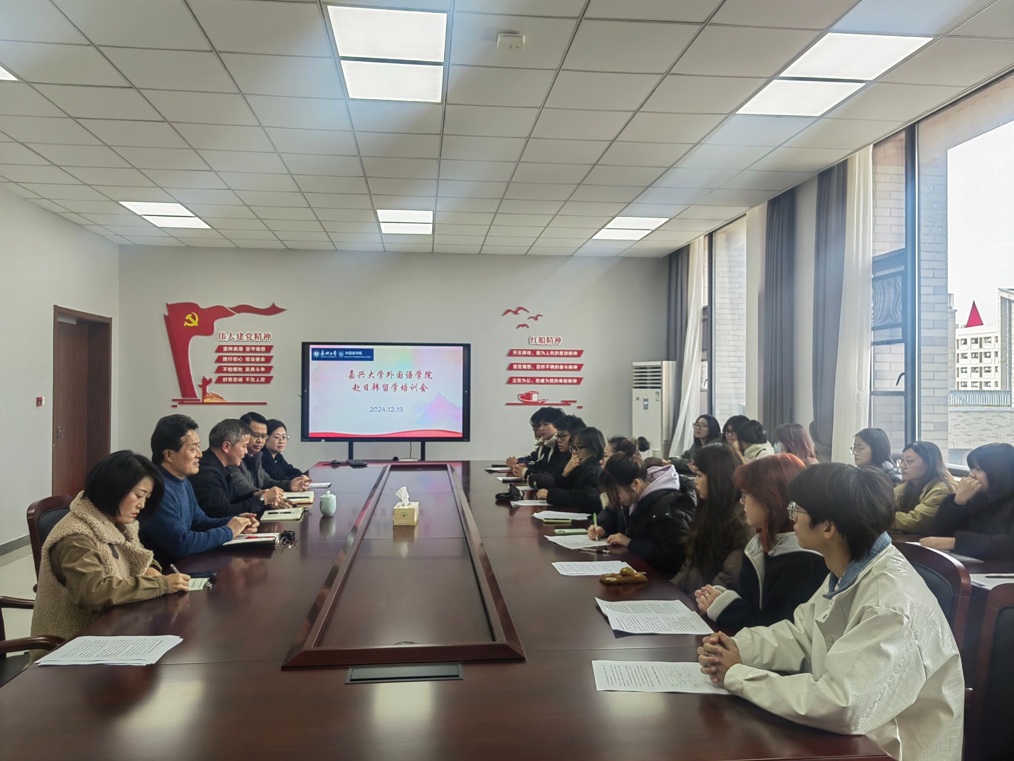 12月19日中午,外国语学院在兴德楼516会议室为2025年春季即将赴日韩留学的20名日语专业学生实施了行前教育,行前教育围绕爱国情怀、文化交际、自身安全、学业提升和外事纪律等方面展开。院长唐艳芳、党委副书记张啸峰、日语专业负责人郭永恩、日语系副主任张艳琴以及国际交流合作处赴日韩留学项目负责人延梅花分别从不同方面做了行前教育辅导,会议由日语系主任助理董旭阳主持。