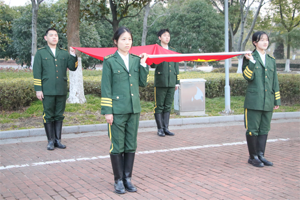 在肃穆庄严的国歌声中,鲜艳的五星红旗缓缓升起,在晨光中迎风飘扬。全体师生庄严肃立,向国旗行注目礼,表达对祖国的无限崇敬与热爱。