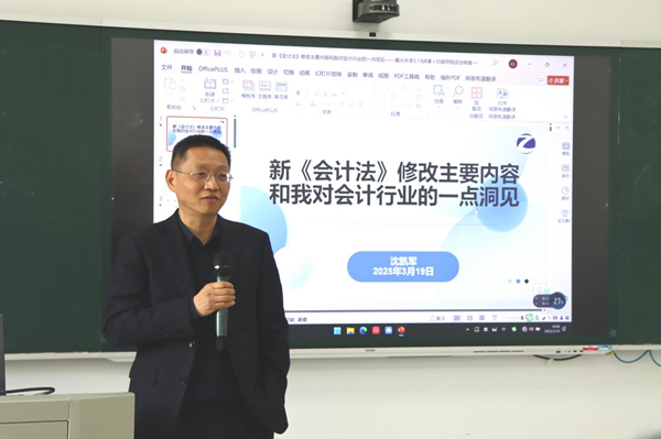 沈凯军以“新《会计法》修改的主要内容和我对会计行业的一点洞见”为主题,详细解读了新《会计法》的15项修改内容,重点分析了本次修改内容对会计信息化、内部监督、违法惩处等方面的影响,并结合自身多年的会计行业从业经验,从会计职业吸引力、审计费和审计聘用模式、信息化对会计行业的影响、会计教育与实务工作、DeepSeek对审计行业的影响等五个方面,分享了他对当前会计行业的一些深刻看法。他还鼓励研究生们积极投身注会行业,在实践中积累经验,提升专业能力。