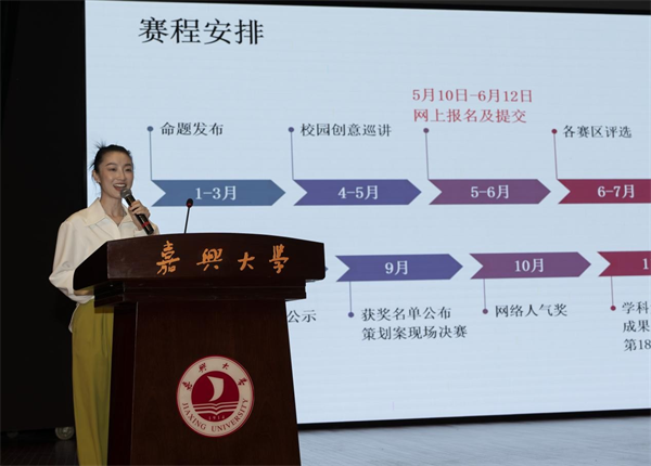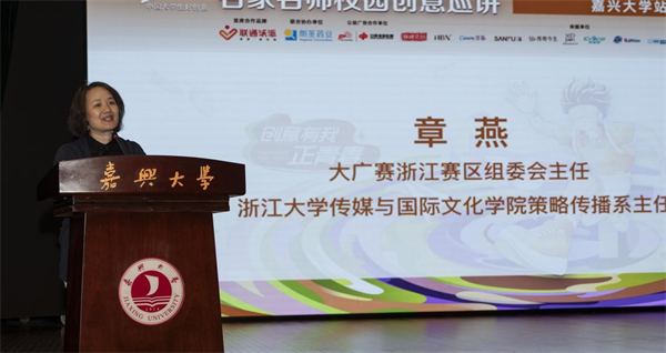 大广赛浙江赛区组委会主任、浙江大学传媒与国际文化学院策略传播系主任章燕回顾了全国大学生广告艺术大赛的创办背景和成效,充分肯定了我校在历年大赛中取得的成绩。她围绕赛事愿景发表讲话,用三个“共”字与学子们共绘蓝图,一是共生——行业与高校需像红船旁的连理枝,为学子开放真实项目,共育人才,让实训扎根实践、让毕设直通爆款;二是共创——嘉兴地区要打响“创意江南”品牌,让水乡古镇的柔美与数字创意的锐气碰撞出独特火花,在世界舞台书写嘉兴范式;三是共燃——每位同学都应成为火种,淬炼真本事,以江南烟雨浸润创意的根系,用红船精神锻造探索的锋芒,用扎根嘉兴的沉淀力,搏击全球潮流的冲击力。
