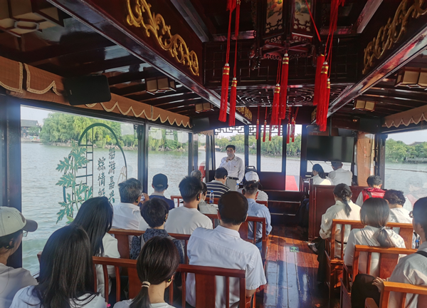 行至狮子汇渡口登船后,活动迎来亮点环节。学校关工委委员、红船银晖讲师团团长陈水林老师在船上为大家带来了一堂别开生面的红船精神党课。陈水林结合自己的研究成果,介绍了中共创建的艰辛历程,从58名早期党员的考证到中共一大南湖会议的考证,深入浅出地阐释了开天辟地、敢为人先的首创精神,坚定理想、百折不挠的奋斗精神,立党为公、忠诚为民的奉献精神。随着船只缓缓驶向湖心岛,生动的讲解让红船精神不再是书本上的文字,而是化作鲜活的力量,深深烙印在每位参与者心中。