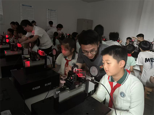 在张子良楼物理实验室,激光干涉仪、光学实验装置等高端科研设备化身“启蒙教具”。柴爱华、戈迪等党员教师团队创新采用“光的波浪模样”“电流变魔术”等生活化比喻,将抽象物理原理转化为可感知的科学现象。学生们在王禹、尤浩等教师及研究生党员志愿者的指导下,分组完成“牛顿环”和“迈克尔逊干涉实验”,亲手调试光学镜片观察彩色干涉条纹,直观理解光的波动性原理。这些充满“科学魔法”的实践时刻,成为少年儿童认知科研的第一扇窗口。