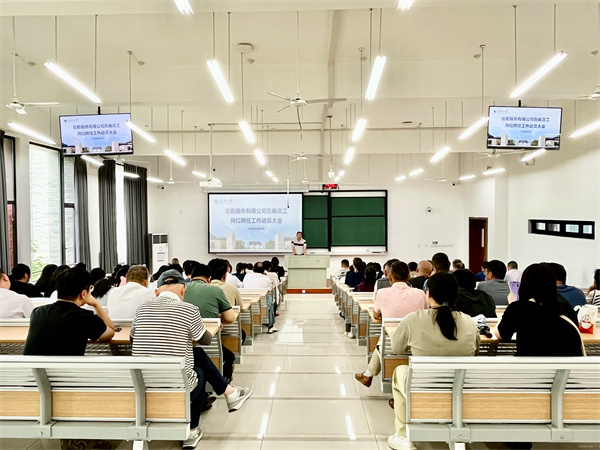 为深化后勤人事制度改革,建立健全岗位聘用制度,完善精简高效的企业化运行体制,充分调动职工工作积极性,6月5日下午,后勤服务有限公司在铭德楼240教室召开2025年在编员工岗位聘任工作动员大会。会议由公司党总支书记、总经理吴国祥主持,副总经理徐建辉、周华丽以及各二级部门负责人、全体在编员工参加会议。